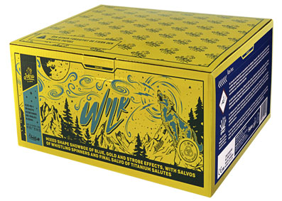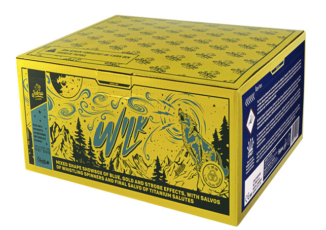 Funke Wilk kombinationsbatteri. Opskyder skud med guldhaler, der eksploderer ensartet i superskarpe nuancer i grøn/blå guld og sølv med blinkere. Finale med trefarvede kraftige splitbomber . Fantastisk finale.99 skud, 20 mm.